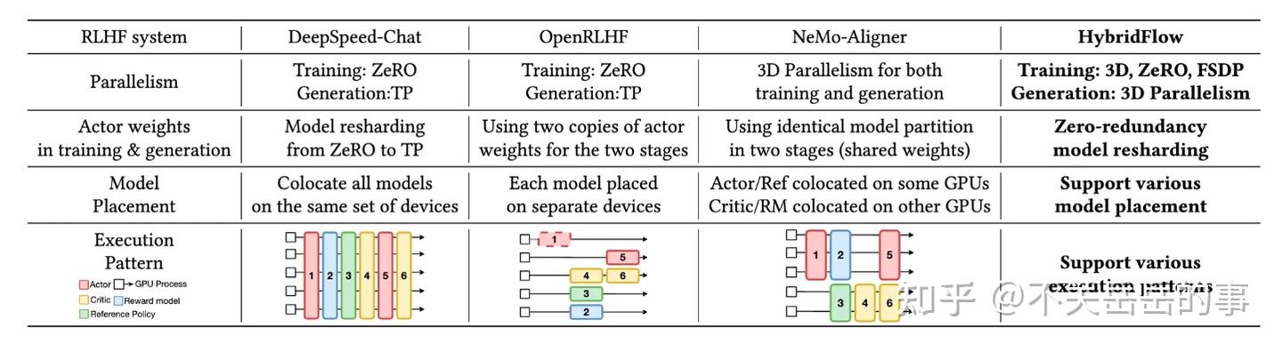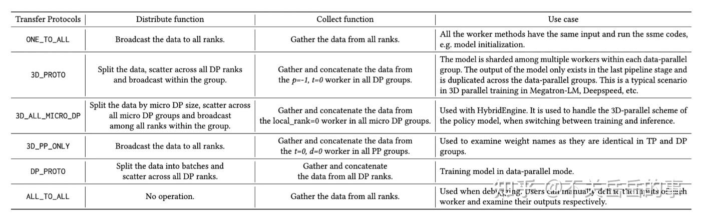 # [AI Infra] VeRL 框架入门&代码带读 > 原文链接:https://zhuanlan.zhihu.com/p/27676081245 ## 背景强化学习(RL)对大模型复杂推理能力提升有关键作用,然而,RL 复杂的计算流程以及现有系统局限性,也给训练和部署带来了挑战。[VeRL](https://link.zhihu.com/?target=https%3A//github.com/volcengine/verl)是字节跳动seed团队和香港大学开发的强化学习仓库。该框架采用混合编程模型,融合单控制器(Single-Controller)的灵活性和多控制器(Multi-Controller)的高效性,可更好实现和执行多种RL算法,显著提升训练吞吐量,降低开发和维护复杂度。 本文会先简单介绍VeRL框架涉及的一些概念,并且简单阅读整理VeRL框架的一些核心算法逻辑,以方便开发者对该框架加深了解。除了VeRL以外,还有[OpenRLHF](https://link.zhihu.com/?target=https%3A//github.com/OpenRLHF/OpenRLHF)等非常优秀的国产开源训练框架,设计理念都非常简洁,且各有一些独特的优势。 ## 相关资料- VeRL框架的论文([HybridFlow](https://zhida.zhihu.com/search?content_id=254557983&content_type=Article&match_order=1&q=HybridFlow&zd_token=eyJhbGciOiJIUzI1NiIsInR5cCI6IkpXVCJ9.eyJpc3MiOiJ6aGlkYV9zZXJ2ZXIiLCJleHAiOjE3NzU3ODg4MjIsInEiOiJIeWJyaWRGbG93IiwiemhpZGFfc291cmNlIjoiZW50aXR5IiwiY29udGVudF9pZCI6MjU0NTU3OTgzLCJjb250ZW50X3R5cGUiOiJBcnRpY2xlIiwibWF0Y2hfb3JkZXIiOjEsInpkX3Rva2VuIjpudWxsfQ.NmK9zYQ_Qqel-HHb36gzuDPWnXGhKpsEUIpMvC6micE&zhida_source=entity)):[https://arxiv.org/pdf/2409.19256](https://link.zhihu.com/?target=https%3A//arxiv.org/pdf/2409.19256) - 论文解读:[https://zhuanlan.zhihu.com/p/24682036412](https://zhuanlan.zhihu.com/p/24682036412) - VeRL框架的官方解读:[https://mp.weixin.qq.com/s/JYQQs2vqnhRz82rtDI-1OQ](https://link.zhihu.com/?target=https%3A//mp.weixin.qq.com/s/JYQQs2vqnhRz82rtDI-1OQ) - 仓库地址:[https://github.com/volcengine/verl](https://link.zhihu.com/?target=https%3A//github.com/volcengine/verl) - Docs:[Welcome to verl’s documentation!](https://link.zhihu.com/?target=https%3A//verl.readthedocs.io/en/) - 知乎上的一些阅读笔记: - [https://zhuanlan.zhihu.com/p/26833089345](https://zhuanlan.zhihu.com/p/26833089345) - [https://zhuanlan.zhihu.com/p/25763072556](https://zhuanlan.zhihu.com/p/25763072556) ## 核心概念尽可能用通俗的话解释一下和本文相关的一些概念: ### General ConceptsRL:RL即强化学习,最近因为o1/r1的缘故,是大模型领域的当红技术。VeRL就是一个主要面向RL的训练框架。个人(从NLP的视角)觉得RL和传统的SFT技术有几点不同: - 1)引入了惩罚信号。众所周知,SFT只是模仿学习正例。而RL不仅对好的样本奖励,也要对坏的样本惩罚。无论是简单的策略梯度,还是GRPO、Reinforce、PPO这些算法,原理都是一致的,本质上只是在设计不同的奖励/惩罚的粒度(token/macro action/seq等等)和力度(需不需要引入baseline,要不要考虑KL限制,要不要clip等等)。 - 2)允许使用当前模型在线产出的样本训练自身。SFT一般学习的都是人工标注或者其他模型生成的样本(即蒸馏)。而RL允许当前模型实时采样样本,并依据这些样本训练自身。 - Rejection Sampling技术也是自己采样训练自己,为什么一般用在SFT阶段? - 其实从这个角度来看,RS技术更像是RL,只不过没有惩罚信号(也可以引入负例进一步做DPO); - on-policy vs. online: - online强调当前策略模型是否能和环境进行交互(比如遇到新的一批数学题目,是否可以做完后实时拿到正确与否的信号),在一些其他场景(如GUI Agent,自动驾驶),允许online需要搭建复杂的simulator; - on-policy强调当前的RL训练数据一定是最新的策略模型实时生成的,在一些时候,会预先采样生成大量的经验数据,然后分mini批次更新,在这种场景下,除了第一个mini-batch是on-policy的,后面的其实是off-policy的; - 所以目前大家用的GRPO/Reinforce/PPO这些一定是online的,但不一定是on-policy(主要看mini-batch num是否大于1); Ray:Ray 是一个分布式计算框架,现在流行的RL框架如VeRL和OpenRLHF都依托Ray管理RL中复杂的Roles(比如PPO需要四个模型)和分配资源。以下是一些核心的概念: - Ray Actor:有状态的远程计算任务,一般是被ray.remote装饰器装饰的Python类,运行时是一个进程(和PPO等Actor-Critic算法的Actor不要混淆了); - Ray Task:无状态的远程计算任务,一般是被ray.remote装饰器装饰的Python函数,创建的局部变量仅在当前可见,对于任务的提交者不可见,因此可以视作无状态; - 资源管理:Ray可以自动管理CPU、GPU、Mem等资源的分配(通过ray.remote装饰器或者启动的options参数可以指定指定的ray actor所需的计算资源),并且还可以设计资源组(placement group),将不同的ray actor指定放置在相同或者不同的资源位置(bundle); - 通过使用ray,verl可以方便地实现各种角色、各种并行策略的资源分配,并且实现hybrid engine等colocate策略; - 异步执行:ray的计算是异步的,一般执行一个ray的计算任务后,ray会立刻返回任务的执行句柄Object reference,用户的代码不会阻塞,可以自行使用ray.get/ray.wait进行阻塞式/轮询式的结果获取; - PS: 在RL训练中引入异步的概念,可以方便actor/critic/generator/rm之间互相overlap掉一些处理时间(比如actor在更新上一个batch的时候,generator已经可以生成下一个batch了)。由于o1-liked rl的主要时间卡点在rollout位置,因此将rollout 更好地aynsc化(例如充分利用线上serving集群的夜晚空闲时间)是未来 rl infra优化的方向之一; 并行策略: - 3D并行:目前的LLM训练(如megatron-lm)和推理引擎(vllm, sglang)都支持了各种并行策略,以加大训推吞吐和减少显存占用,包括:数据并行(DP)、张量并行(TP,层内部切分并行)、流水线并行(P